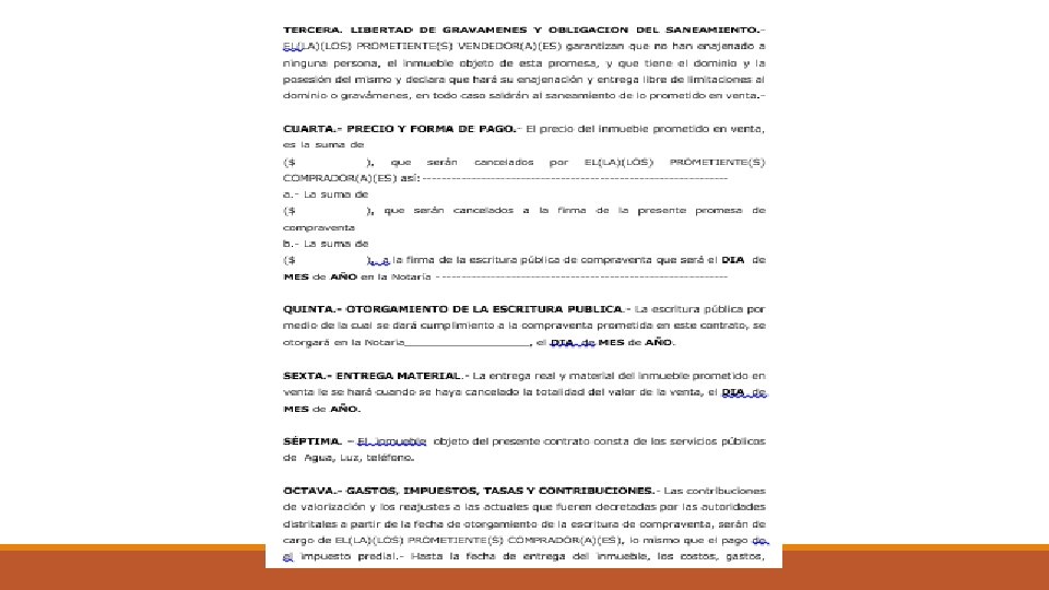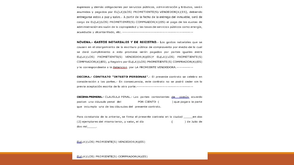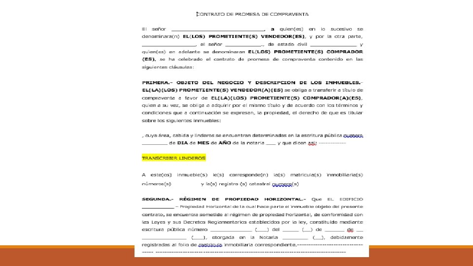 PARTES EN EL CONTRATO UNILATERAL q PROMITENTE. Es aquel para quien resulta la obligación derivada de esa promesa de contrato. q BENEFICIARIO. Es la parte que se beneficia de la obligación contraída por la otra parte. CONTRATO BILATERAL Las partes son de forma simultánea promitente y beneficiaria, pues se engendran obligaciones recíprocas.