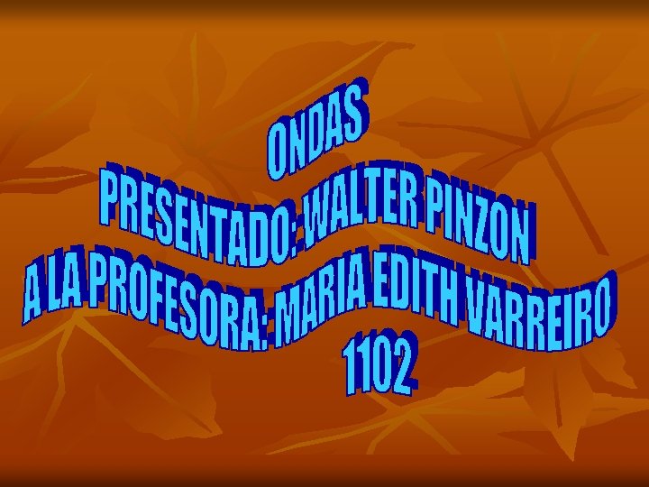 n n Ondas bidimensionales o superficiales: son ondas que se propagan en dos direcciones. Pueden propagarse, en cualquiera de las direcciones de una superficie, por ello, se denominan también ondas superficiales. Un ejemplo son las ondas que se producen en la superficie de un lago cuando se deja caer una piedra sobre él. Ondas tridimensionales o esféricas: son ondas que se propagan en tres direcciones. Las ondas tridimensionales se conocen también como ondas esféricas, porque sus frentes de ondas son esferas concéntricas que salen de la fuente de perturbación expandiéndose en todas direcciones. El sonido es una onda tridimensional. Son ondas tridimensionales las ondas sonoras (mecánicas) y las ondas electromagnéticas.