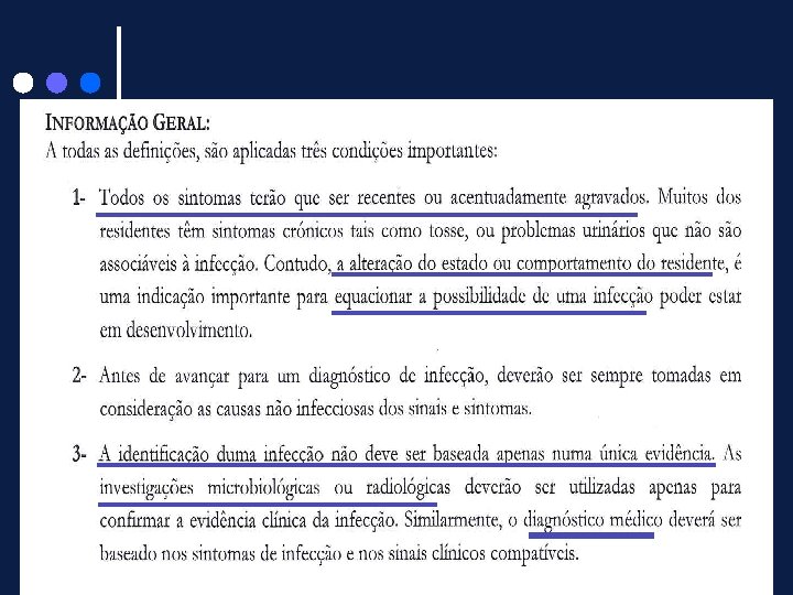 Infeções das Vias Urinárias Os resultados do exame microbiológico de urina não foram incluídos nestes critérios!. . . Mas se o residente tiver uma amostra de urina (devidamente colhida e processada) e, se na altura do estudo, o residente não estiver a tomar antibióticos, deve-se registar o resultado da urocultura: positiva, negativa ou contaminada. Muito importante: a associação da febre com agravamento do estado mental ou funcional do residente, sem outra causa preenche os critérios de infeção das vias urinárias MAS O residente pode ter febre com agravamento do estado mental, mas ter critérios de infeção noutra localização Registar a outra localização!!!