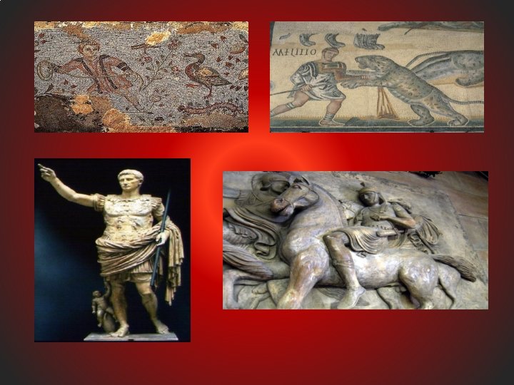 Roman Art • Mosaics were popular in Rome. A mosaic is a picture made out of small, colored tiles or pieces of glass. • The Romans also made great statues that looked like the real thing, even though they were made from stone.