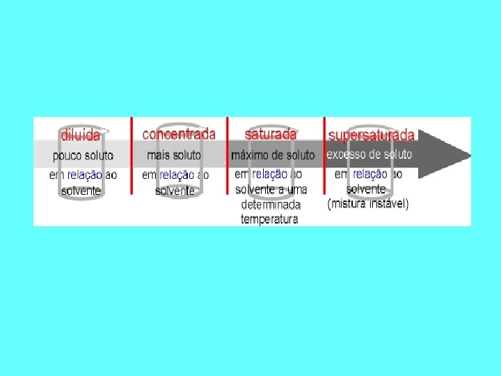 • Solução Saturada Quando a quantidade de soluto dissolvida for igual à especificada pela solubilidade. • Solução Insaturada Quando a quantidade de soluto dissolvida for inferior à especificada pela solubilidade.