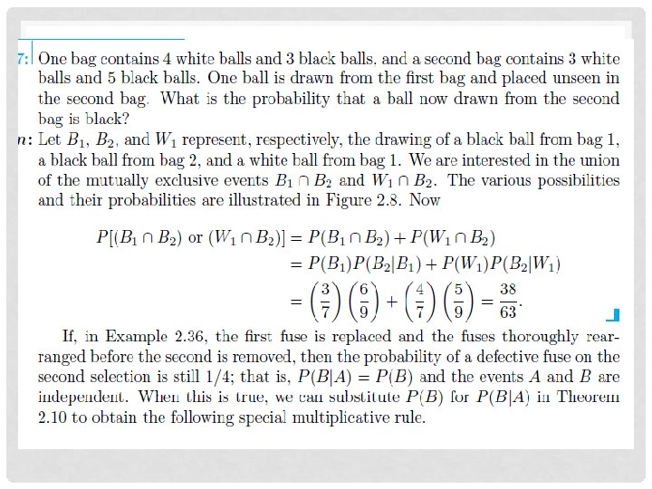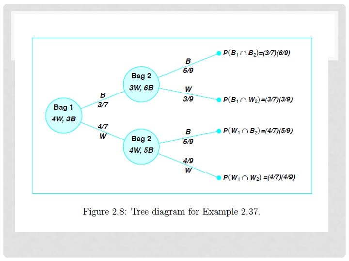 • Suatu kantung berisi 4 bola putih dan 3 bola hitam. Kantung kedua berisi 3 bola putih dan 5 bola hitam. Satu bola diambil dari kantung pertama tanpa melihatnya dan dimasukkan ke kantung kedua. Berapa peluang mengambil bola hitam dari kantung kedua.