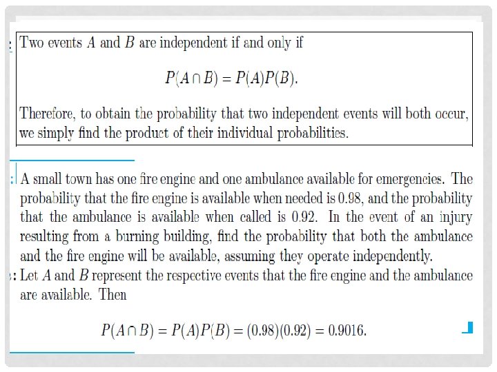 • Contoh • Kotak berisi 20 sekering dan lima diantaranya cacat. Jika diambil dua sekering satu demi satu tanpa pengembalian, berapa peluang dua sekering cacat. • Jawab • Misal A= sekering pertama cacat • Misal B= sekering kedua cacat • P(A. B)=P(A)P(B/A) • P(A. B)=(5/20)(4/19)=1/19 • Secara umum • P(A. B. C. D)=P(A)P(A/B)P(C/A. B)P(D/A. B. C)