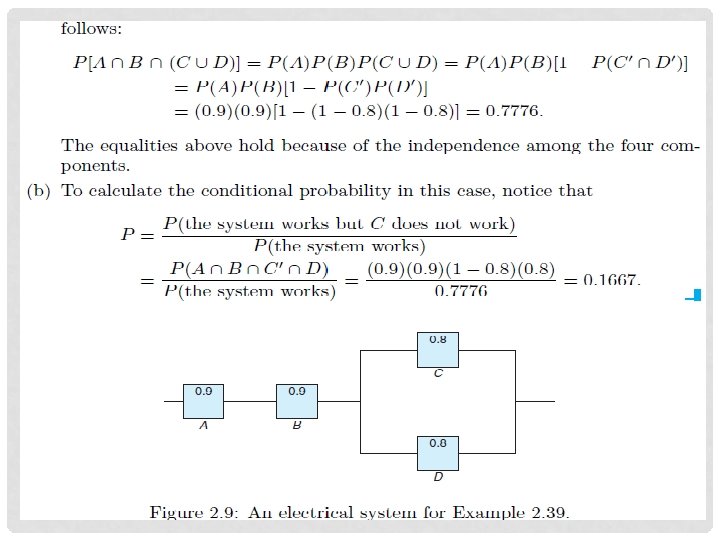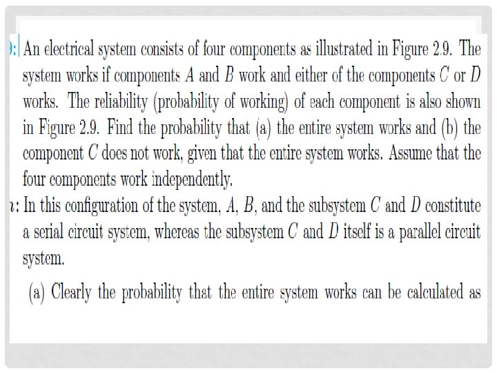 • Misal Ai=pompa i dapat dijalankan pada waktu to. P(A 1)=. . . =P(A 5)=p. Misal B= air mengalir ke tujuan pada waktu to. P(B)=R(p) • P(B)= P(B. A 5)+P(B. A 5*) • =P(B/A 5)P(A 5)+P(B/A 5*)P(A 5*) • =p. P(B/A 5)+(1 -p)P(B/A 5*) • P(B/A 5*)=P((A 1. A 2)U(A 3. A 4)/A 5*) • =P(A 1. A 2/A 5*)+P(A 3. A 4/A 5*)-P(A 1 A 2 A 3 A 4/A 5*) • = p 2+p 2 -p 4=2 p 2 +p 4 • P(B/A 5)=P(A 2 UA 4/A 5) • =P(A 2/A 5)+P(A 4/A 5)-P(A 2 A 4/A 5) • = p +p – p 2= 2 p – p 2 • Sehingga P(B)= p(2 p-p 2)+(1 -p)(2 p 2 – p 4) = 4 p 2 – 3 p 3 – p 4 + p 5