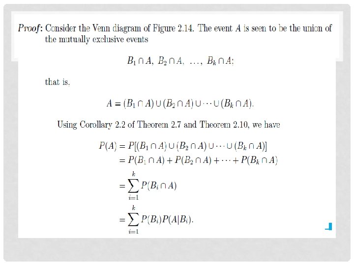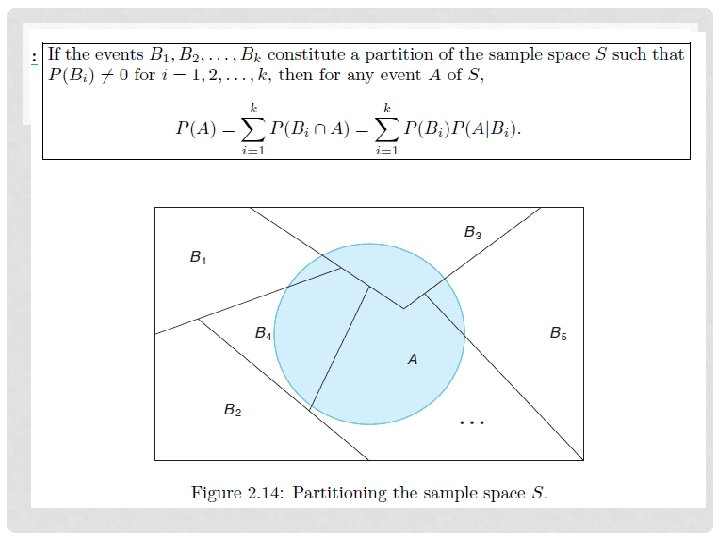 KAIDAH TOTAL PELUANG Bila kejadian – kejadian Bi untuk i = 1, 2, …, k, maka untuk sembarang kejadian A yang merupakan himpunan bagian S berlaku P(A) = P(B 1) P(A|B 1) + P(B 2) P(A|B 2) + … + P(Bk) P(A|Bk).