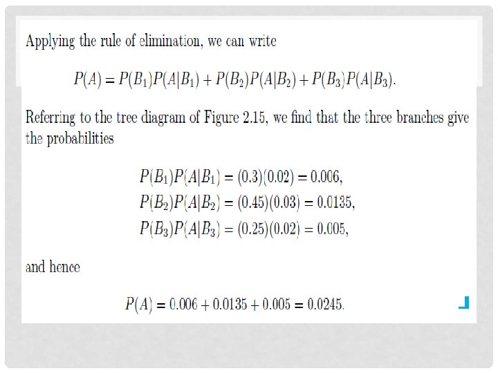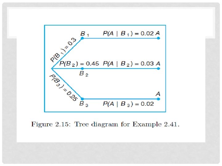 CONTOH 2 • Sebuah toko menjual bola lampu. Empat puluh lima persen dari bola lampu yang dijual toko tersebut diproduksi oleh pabrik A dan sisanya diproduksi oleh pabrik B. Bola lampu yang diproduksi pabrik A mempunyai peluang cacat sebesar 3 persen sedangkan yang diproduksi pabrik B mempunyai peluang cacat sebesar 5 persen. Bila seseorang membeli bola lampu dari toko tersebut, berapa peluang dia akan mendapatkan bola lampu yang cacat?