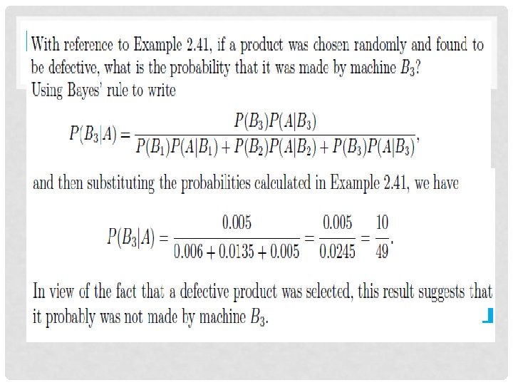 Untuk masalah pada contoh 2, misalkan ada seseorang yang membeli bola lampu dari toko tersebut. Setelah sampai rumah dan dicoba, ternyata lampu tersebut cacat. Berapa peluang bahwa lampu tersebut diproduksi oleh pabrik A?