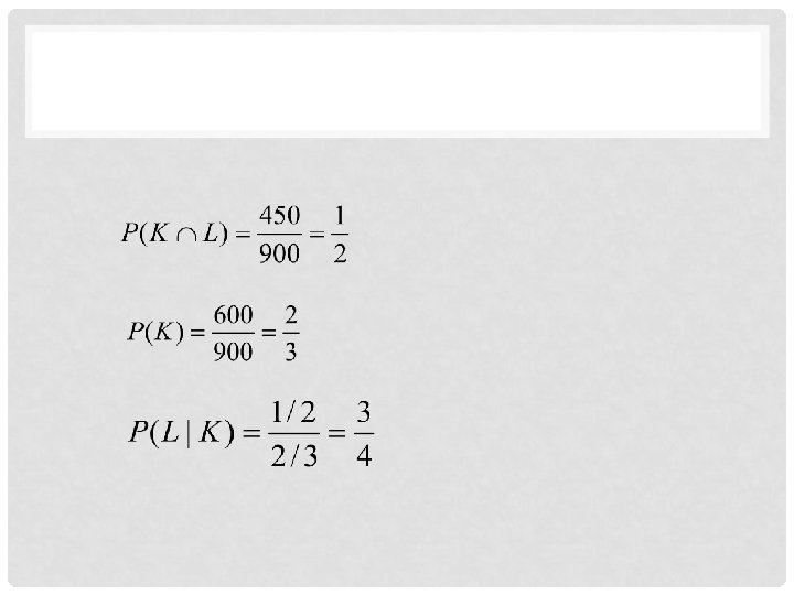 Perhatikan kejadian – kejadian berikut : L : kejadian yang terpilih laki - laki K: kejadian yang terpilih adalah orang yang melanjutkan ke perguruan tinggi Dengan menggunakan ruang contoh yang dipersempit K, maka akan didapatkan P(L|K) = 450/600 = ¾