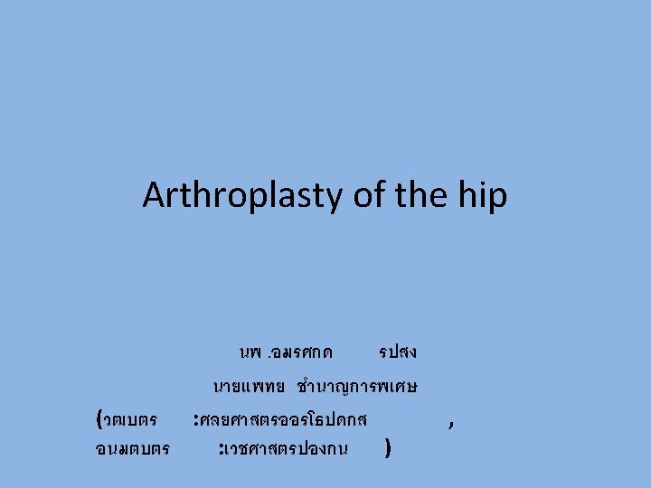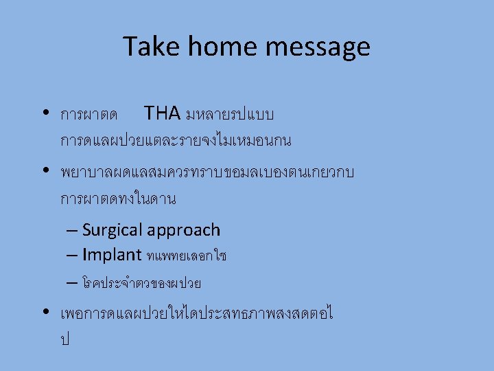 Posterior approach • Precautions for the first 6 weeks – – – Should not bend your hip beyond 90° Should not bring your legs or knees together Use a pillow between your legs in bed Do not rotate your operative leg inward Use a reacher to pick objects off the floor ไมถก ถกตอง