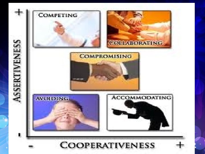 d Dimensions Cooperativeness: • Attempting to satisfy the other party’s concerns. Assertiveness: • Attempting to satisfy one’s own concerns.