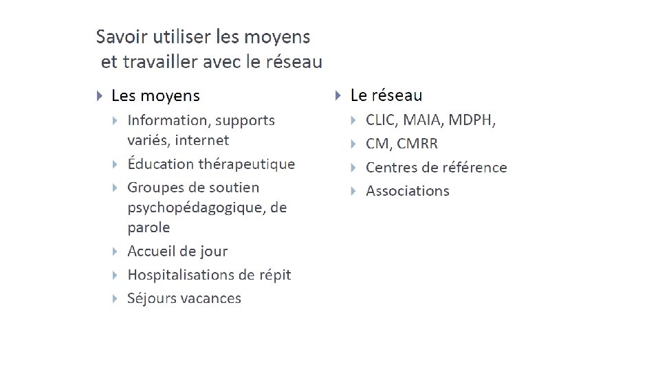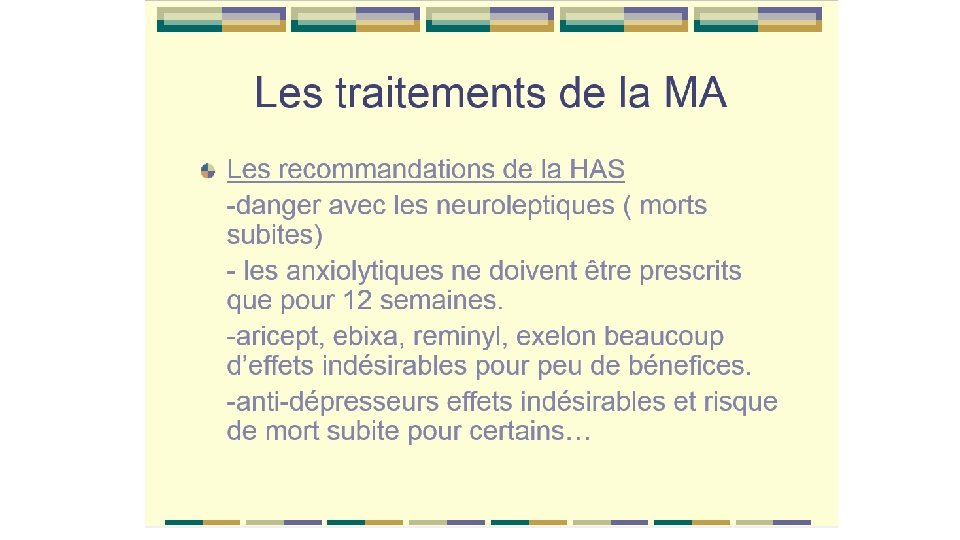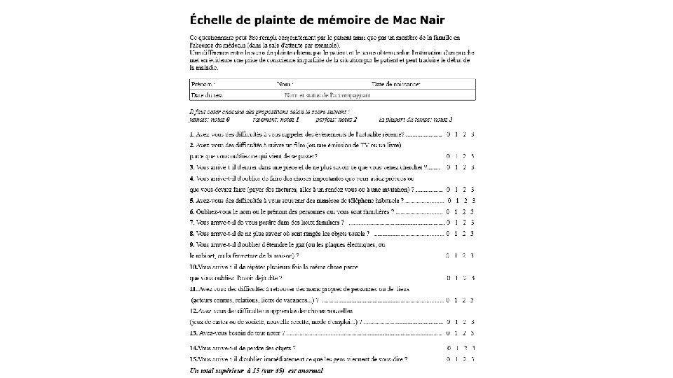 Signes d’alertes plaintes somatiques (douleurs ++), plainte anxieuse, plainte mnésique, insomnie, anorexie, asthénie, amaigrissement, désintérêt pour les activités habituelles, irritabilité, agressivité, colère changement de comportement, difficultés de concentration Pessimisme, baisse d’efficacité, perte de la libido Signes de la dépression Repli sur soi, tristesse, souffrance morale, perte d’intérêt, ralentissement, idées noires et suicidaires , manque d’estime de soi Anhédonie : perte de la capacité à ressentir le plaisir, Forme graves Risque suicidaire avec passage à l’acte Risque nutritionnel Retentissement sur l’autonomie