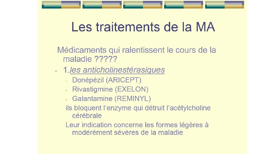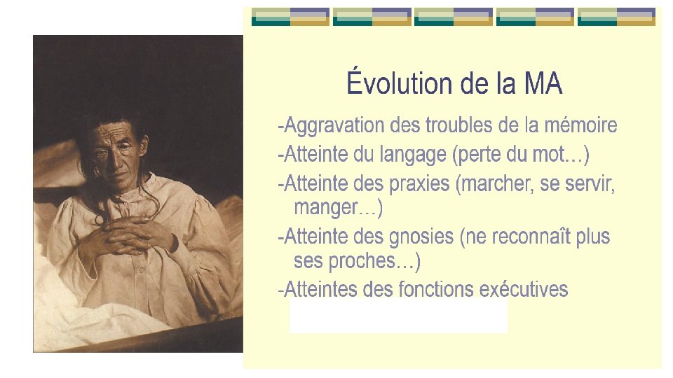 Aphasie: appauvrissement du discours Apraxie: altération de l’habilité gestuelle agnosie: mauvaise perception, mauvaise reconnaissance Pas au premier plan, apparition avec le suivi Attention au verni social