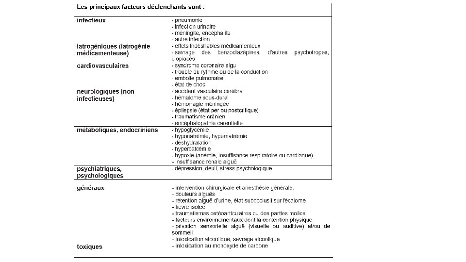 Les principaux facteurs prédisposant sont : • démence avérée ou troubles cognitifs chroniques sous-jacents • immobilisation, aggravée par une contention physique • déficit sensoriel (visuel ou auditif) • comorbidités multiples • dénutrition • polymédication • antécédents de confusion, notamment postopératoire • troubles de l’humeur, en particulier états dépressifs