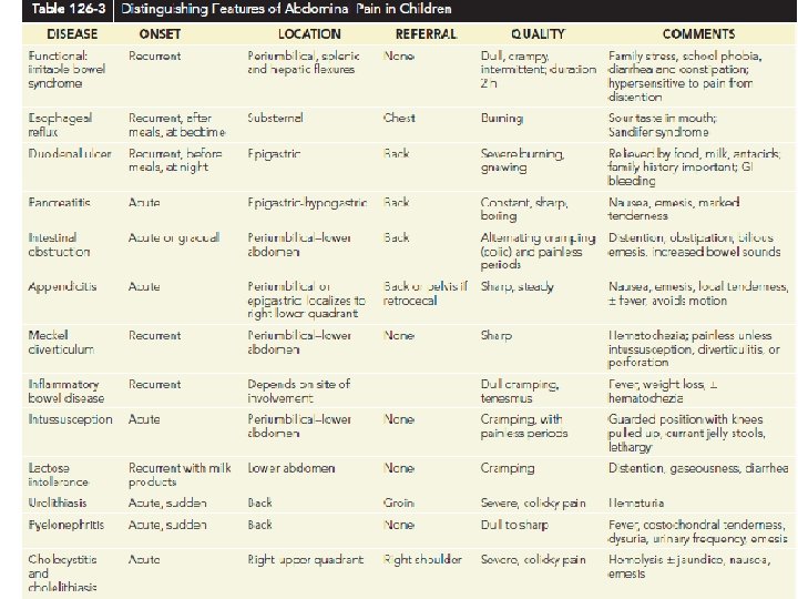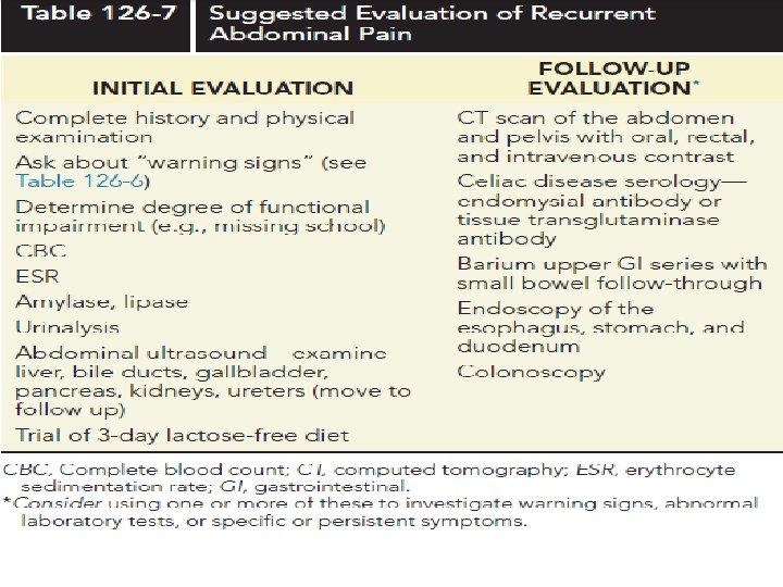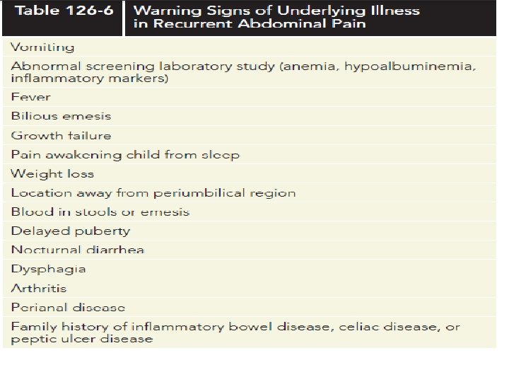 Red flags of recurrent abdominal pain History - Waking up at night because - Dysphagia of pain - Recurrent vomitting- Family history of IBD, Celiac , - Chronic diarrhea Clinical - Blood in stool - Impaired growth - Weight loss -delayed puberty - Rebound Tenderness - Recurrent fever , guarding , abdominal - Skin rash distention , splenomegaly , - Mouth sores hepatomegaly - Arthritis -waking up at night - Perineal disease (tag , fissure , fistula) Because of pain - Occult or gross blood in stool