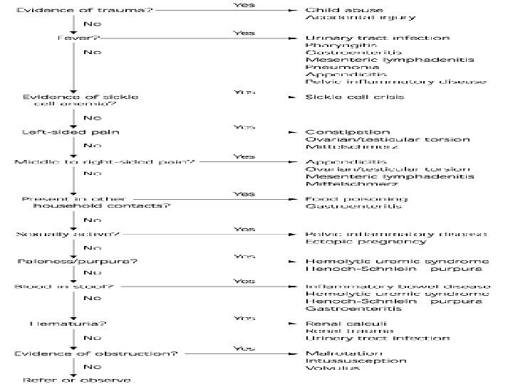 Physical examination • physical examination is essential including assessment of growth, anaemia, clubbing, oral ulceration, and perianal disease. • Abdomen : Parents should observe the abdominal examination as distraction, often achieved by discussing siblings, can result in marked abdominal tenderness disappearing. It is important for parents to observe this but vital to reassure them that disappearance of tenderness during distraction does not mean the pain is fraudulent. • Genitalia : testicular torsion, hernia.