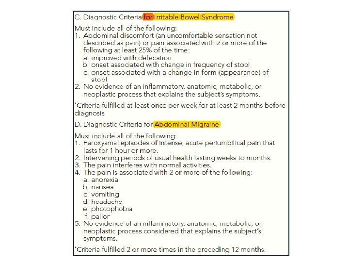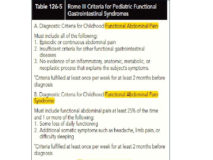 Functional abdominal pain: ✔ Pain almost daily ✔ Not associated with meals ✔ Not relieved by defecation ✔ Pain worst in the morning ✔ Result from stress ✔ Prevent or delays children from attending school. Irritable bowel syndrome(IBS) Is a subset of functional abdominal pain, characterized by: ✔Onset of pain at the time of a change in stool frequency or consistency, ✔A stool pattern fluctuating between diarrhea and constipation ✔Relief of pain with defecation. ✔Symptoms in IBS are linked to gut motility.