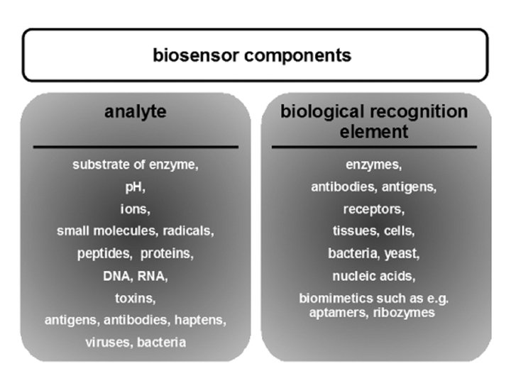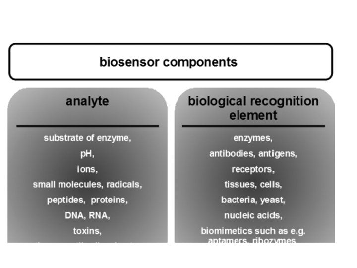 Conti… • Function • To interact specifically with a target compound i. e compound to be detected. • It must be capable of detecting the presence of a target compound in the test solution. • The ability of a bio-element to interact specifically with the target compound (specifically) is the basis for biosensor.