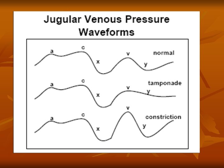 Identifying Wave Forms n n n The x descent occurs just prior to the second heart sound ( during systole), while the y descent occurs after the second heart sound (during diastole). Normally X descent is more prominent than Y descent is only sometimes seen during diastole. Descents are better seen than positive waves. The a wave occurs just before the first sound or carotid pulse and has a sharp rise and fall. The v wave occurs just after the arterial pulse and has a slower undulating pattern. The c wave is never seen normally.