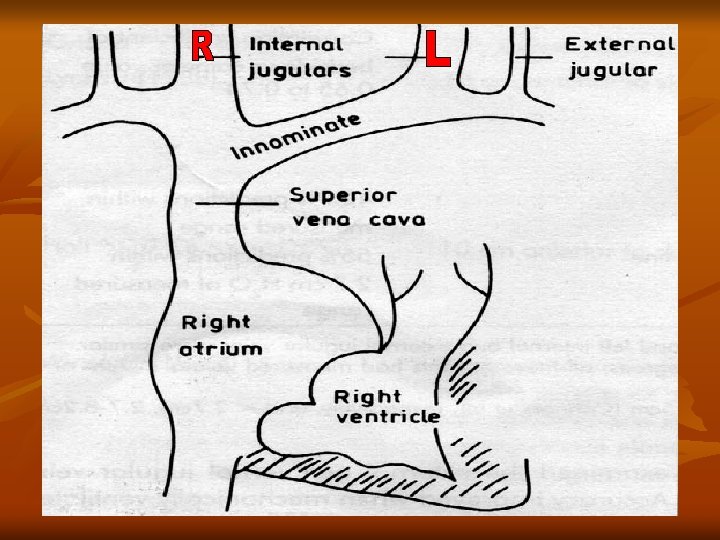 Why Internal Jugular Vein? n n IJV has a direct course to RA. IJV is anatomically closer to RA. IJV has no valves( Valves in EJV prevent transmission of RA pressure) Vasoconstriction Secondary to hypotension ( in CCF) can make EJV small and barely visible.