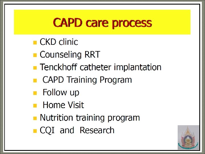 When to start Renal Replacement Therapy 1. ���� (Counseling) e. GFR 20 – 30 ml / min / 1. 73 m 2 2. ����� (Placement of dialysis catheter) CAPD / HD e. GFR = 10 ml / min / 1. 73 m 2 3. ����� (Recommended to start RRT) e. GFR = 5 – 10 4. ������ (Must do) uremic syndrome : weight loss acidosis, hyper K, N & V