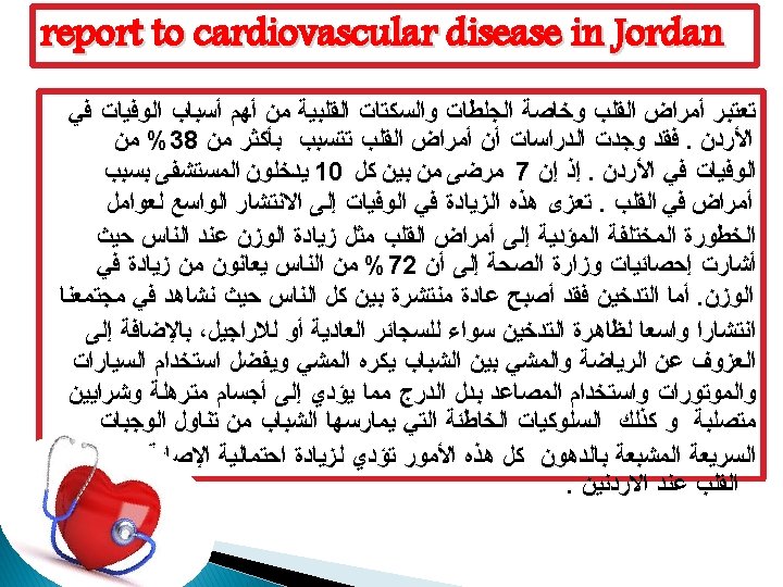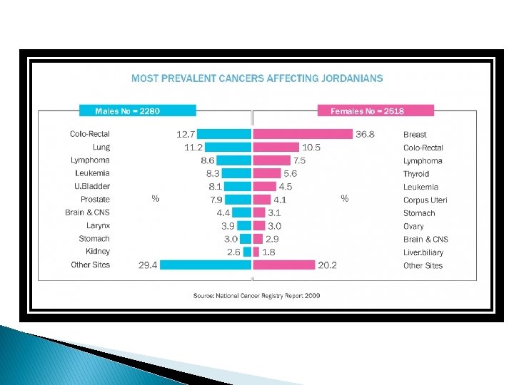 report to cancer in joran üCancer is the second most common cause of death after cardiovascular diseases in Jordan. üMost common type of cancer in Jordan is breast cancer (36%). üBoth cancer incidence and prevalence have been increasing in the last few years in Jordan üThe main cause of cancer in Jordan is unhealthy diet and tobacco use. üthe Ministry of Health evolving suitable policies to reduce the mortality and morbidity rate to cancer in Jordan. üDo many program in Jordan related to screening and treatment of cancer like the Jordan Breast Cancer Program.