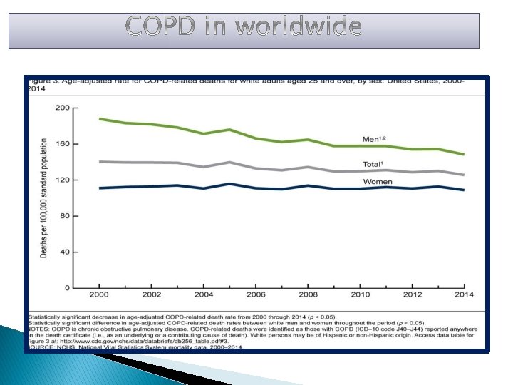 Risk factor: Ø Cigarette smoking. Ø Long-term exposure to other lung irritants. Ø Some people who have asthma can develop COPD
