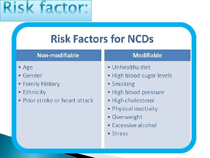 Summary : � Compare between communicable and non communicable disease � Statistic to NCD in worldwide and in Jordan � Risk group to NCD � Risk factor of NCD � Four main type to NCD � How we can prevent each type � Role of community nurse in prevent and control of NCD