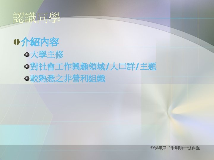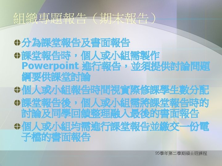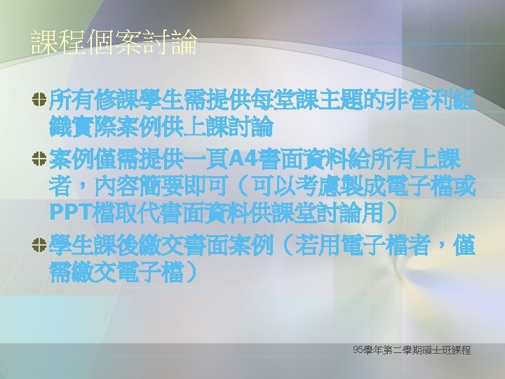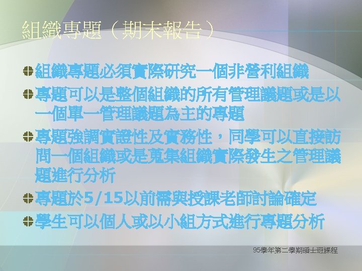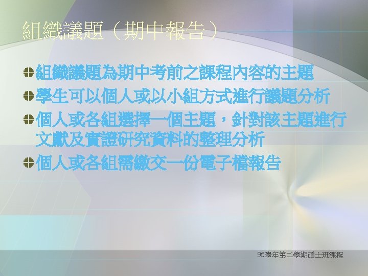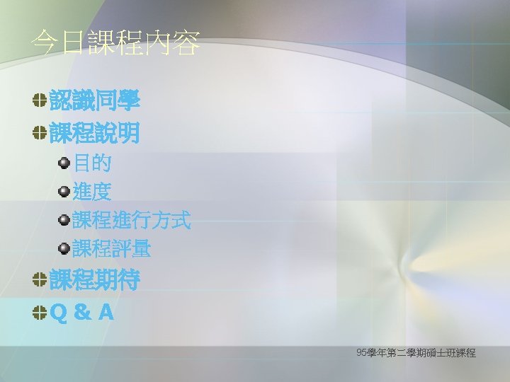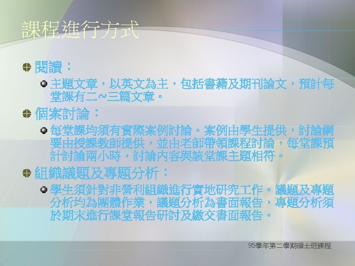 Definition of critical thinking Purpose for Thinking: goal, objective Question at Issue: the problem Concepts: theories, definitions, axioms, laws, principles, models Assumptions: presuppositions, taken for granted Information: data, facts, observations, experiences Interpretations & Inferences: conclusions, solutions Points of View: frame of reference, perspective, orientation Consequences & Implications (--from the website of The Wikipedia ) 95學年第二學期碩士班課程