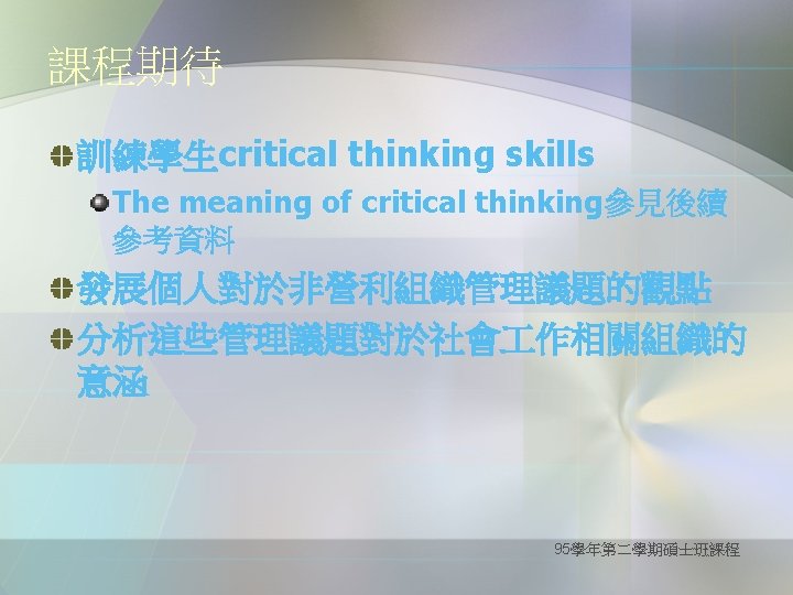 Definition of critical thinking Wikipedia英文維基百科 http: //en. wikipedia. org/wiki/Critical_thinking The Critical Thinking Community http: //www. criticalthinking. org/about. CT/defin ing. CT. shtml 95學年第二學期碩士班課程
