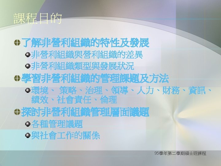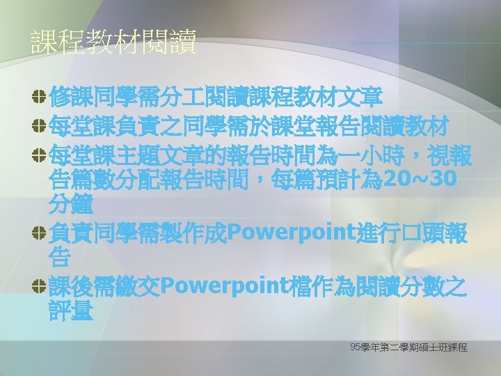 A well cultivated critical thinker raises vital questions and problems, formulating them clearly and precisely; gathers and assesses relevant information, using abstract ideas to interpret it effectively comes to well-reasoned conclusions and solutions, testing them against relevant criteria and standards; thinks open-mindedly within alternative systems of thought, recognizing and assessing, as need be, their assumptions, implications, and practical consequences; and communicates effectively with others in figuring out solutions to complex problems. (--from the website of The Critical Thinking Community ) 95學年第二學期碩士班課程