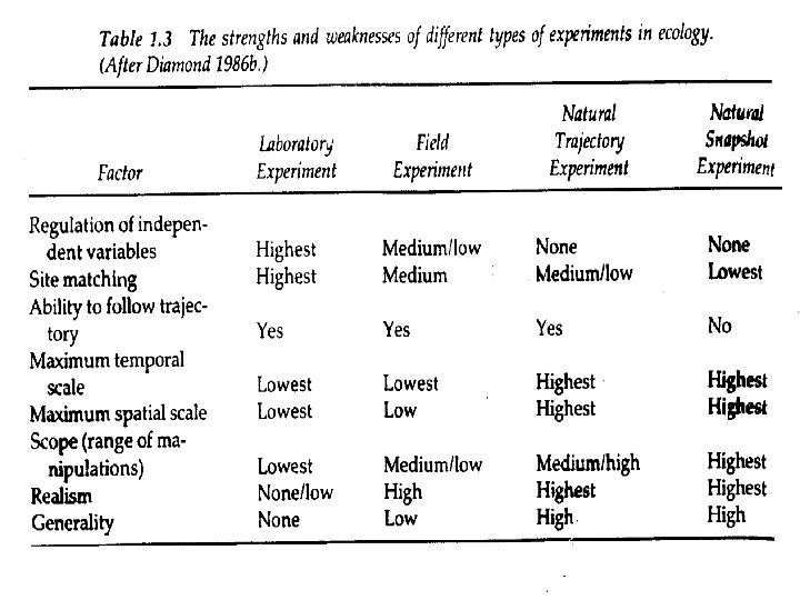 Methods of studying ecology n To understand, describe, explain, predict and control n Scale n Lab experiment, field experiment, natural trajectory experiment, natural snapshot experiment, mathematical model