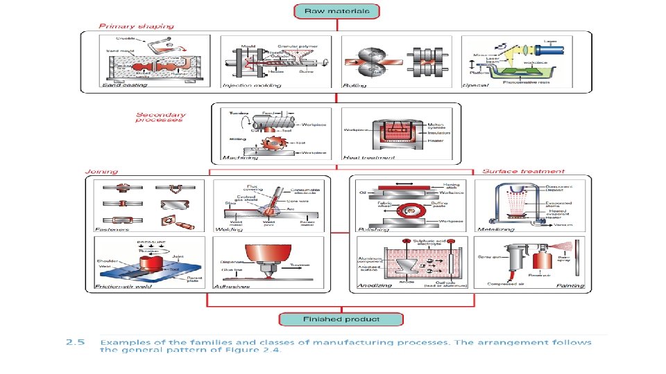 Manufacturing processes can be grouped as: q Casting, foundry or moulding processes. q Forming or metal working processes. q Machining (metal removal) processes. q Joining and assembly q Surface treatments (finishing). q Heat treating These groups are not mutually exclusive. For example, some finishing processes involve a small amount of metal removal or metal forming. A laser can be used for joining/metal removal/heat treating.