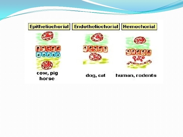 Classification based on which maternal layers are retained in the placenta. (which of course is the same as stating which maternal tissue is in contact with chorionic epithelium of the fetus) Each of the possibilities is observed in some group of mammals. Maternal Layers Retained Type of Placenta Examples Endometrial Epithelium Connective Tissue Uterine Endothelium Epitheliochorial + + + Horses, swine, ruminants Endotheliochorial - - + Dogs, cats Hemochorial - - - Humans, rodent s