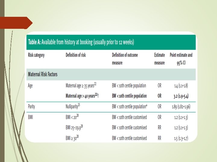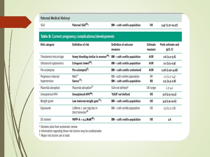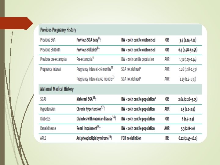Risk factors for a SGA fetus/neonate : All women should be assessed at booking for risk factors for a SGA fetus/neonate to identify those who require increased surveillance. Women who have a major risk factor (OR > 2. 0) should be referred for serial ultrasound measurement of fetal size and assessment of wellbeing with umbilical artery Doppler from 26– 28 weeks of pregnancy.