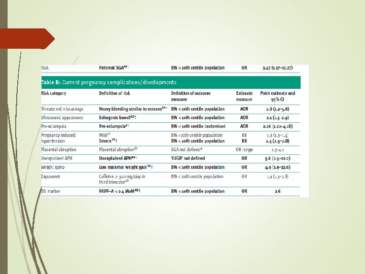SGA birth is defined as EFW or AC less than the 10 th centile and severe SGA as an EFW or AC less than the 3 rd centile.