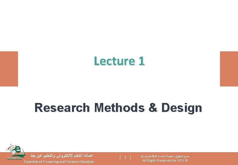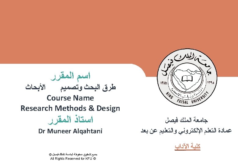 Definitions What is Research The systematic investigation into Slides: 7 Download presentation Definitions What is Research? The systematic investigation into and study of materials and sources in order to establish facts and reach new conclusions. What are methods? A particular procedure for accomplishing or approaching something, esp. a systematic or established one. What is design? It is a logical structure of the inquiry (research) ﻋﻤﺎﺩﺓ ﺍﻟﺘﻌﻠﻢ ﺍﻹﻟﻜﺘﺮﻭﻧﻲ ﻭﺍﻟﺘﻌﻠﻴﻢ ﻋﻦ ﺑﻌﺪ Deanship of E-Learning and Distance Education [ 3 ] © ﺟﻤﻴﻊ ﺍﻟﺤﻘﻮﻕ ﻣﺤﻔﻮﻇﺔ ﻟﺠﺎﻣﻌﺔ ﺍﻟﻤﻠﻚ ﻓﻴﺼﻞ All Rights Reserved for KFU © Types Of Research Descriptive Explanatory Ethnographic Experimental Action research Case study Longitudinal vs. cross-sectional ﻋﻤﺎﺩﺓ ﺍﻟﺘﻌﻠﻢ ﺍﻹﻟﻜﺘﺮﻭﻧﻲ ﻭﺍﻟﺘﻌﻠﻴﻢ ﻋﻦ ﺑﻌﺪ Deanship of E-Learning and Distance Education [ 4 ] © ﺟﻤﻴﻊ ﺍﻟﺤﻘﻮﻕ ﻣﺤﻔﻮﻇﺔ ﻟﺠﺎﻣﻌﺔ ﺍﻟﻤﻠﻚ ﻓﻴﺼﻞ All Rights Reserved for KFU © Quantitative vs. Qualitative Quantitative: you collect data through some tools and you quantify them Qualitative: you collect data through some tools and you explain and discuss, argue, hypothesis and philosophy them. ﻋﻤﺎﺩﺓ ﺍﻟﺘﻌﻠﻢ ﺍﻹﻟﻜﺘﺮﻭﻧﻲ ﻭﺍﻟﺘﻌﻠﻴﻢ ﻋﻦ ﺑﻌﺪ Deanship of E-Learning and Distance Education [ 5 ] © ﺟﻤﻴﻊ ﺍﻟﺤﻘﻮﻕ ﻣﺤﻔﻮﻇﺔ ﻟﺠﺎﻣﻌﺔ ﺍﻟﻤﻠﻚ ﻓﻴﺼﻞ All Rights Reserved for KFU © Classical Report of Research Abstract Introduction Literature Review Methods Data Analysis Results Discussion Conclusion Bibliography Appendices http: //privatewww. essex. ac. uk/~scholp/report. htm ﻋﻤﺎﺩﺓ ﺍﻟﺘﻌﻠﻢ ﺍﻹﻟﻜﺘﺮﻭﻧﻲ ﻭﺍﻟﺘﻌﻠﻴﻢ ﻋﻦ ﺑﻌﺪ Deanship of E-Learning and Distance Education [ 6 ] © ﺟﻤﻴﻊ ﺍﻟﺤﻘﻮﻕ ﻣﺤﻔﻮﻇﺔ ﻟﺠﺎﻣﻌﺔ ﺍﻟﻤﻠﻚ ﻓﻴﺼﻞ All Rights Reserved for KFU ©