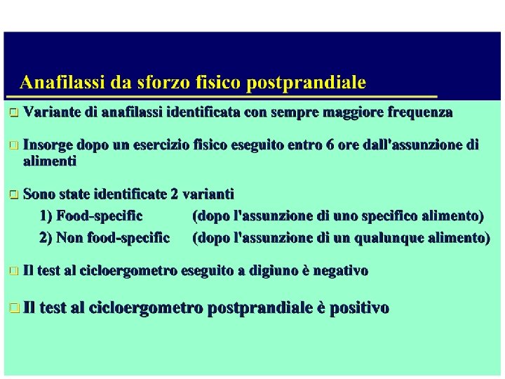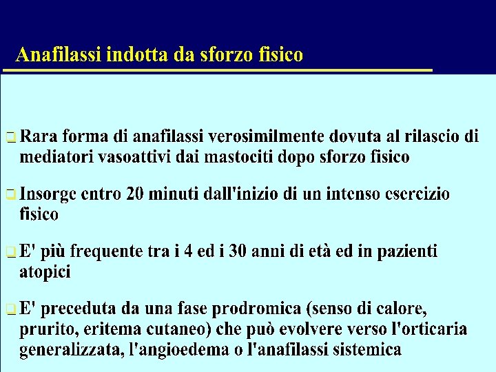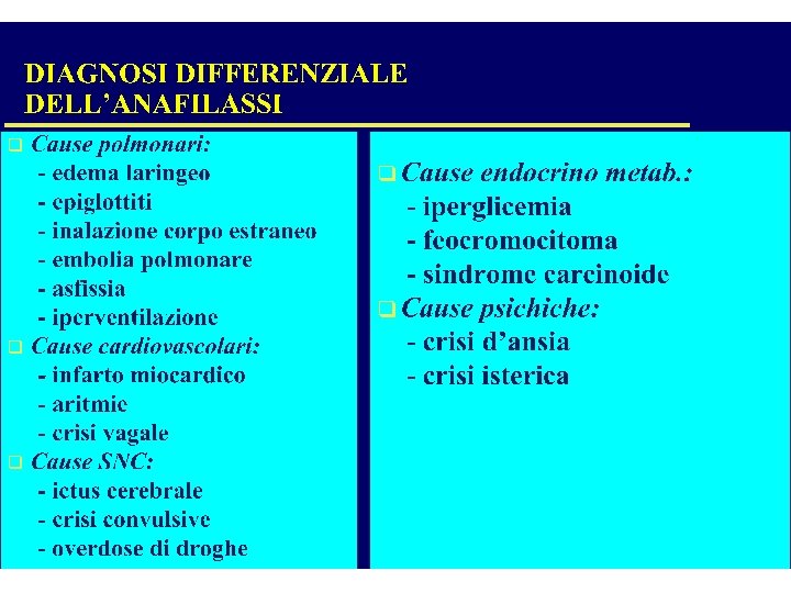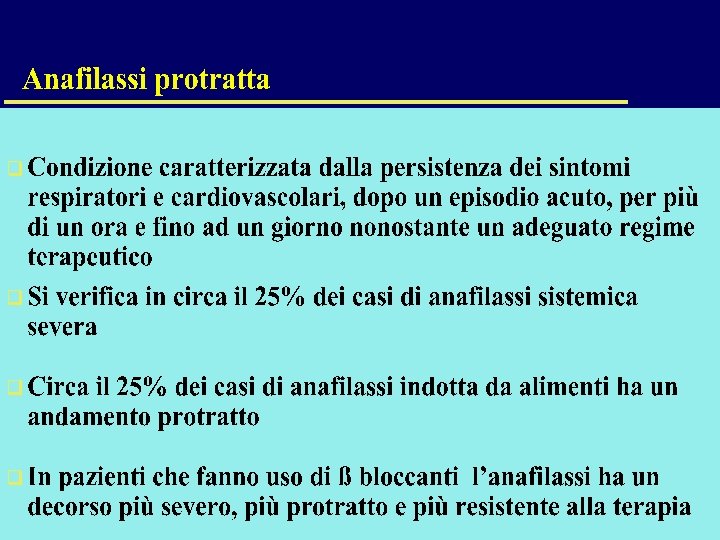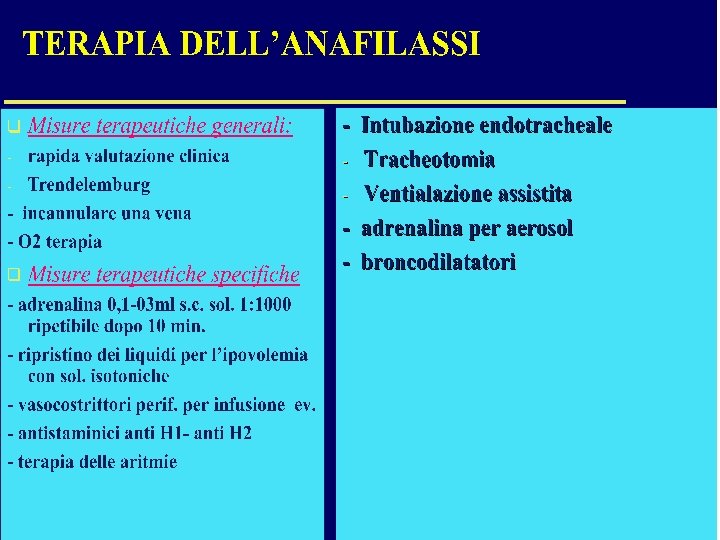 TERAPIA DELL’ANAFILASSI (FARMACI SECONDARI) • • • ANTISTAMINICI Clorfenamina-Idrossizina: vanno somministrati e. v. lentamente (3 -5 min. ) l’azione rapida può provocare effetti collaterali Utile l’associazione con anti H 2 del tipo Cimetidina (300 mg e. v. ) o Ranitidina (150 mg e. v. ) nel prevenire effetti cardiovascolari legati all’istamina CORTISONICI Inibiscono le fosfolipasi di membrana Inibiscono il rilascio di istamina e di LTC 4 dai basofili umani Potenziano l’effetto dei farmaci ß 2 -adrenergici Riducono le reazioni ritardate (late phase reactions) a livello cutaneo e bronchiale, esplicano la loro azione farmacologica dopo almeno 1 ora