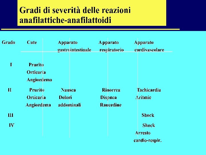 FATTORI DI RISCHIO • • ETA’ (ADULTI) SESSO (DONNE) VIA INIETTIVA(E. V. , I. M) NUOVA ESPOSIZIONE DOPO PERIODO DI INTERRUZIONE MASTOCITOSI SISTEMICA TEMPO TRASCORSO ULTIMA REAZIONE BETA BLOCCANTI, ACE INIB. , BIGUANIDI TRIPTASI SIERICA AUMENTATA