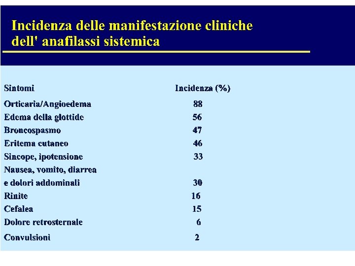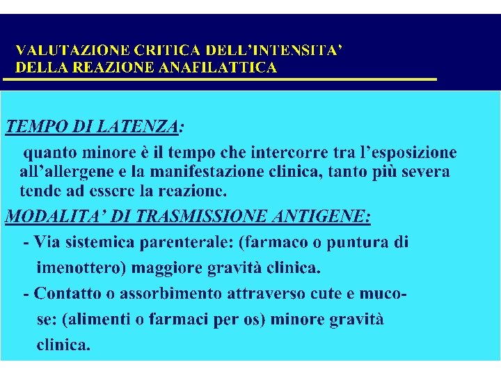 EPIDEMIOLOGIA • IN PASSATO LE PENICILLINE RAPPRESENTAVANO GLI AGENTI RESPONSABILI DELLE REAZIONI SEVERE PIU’ FREQUENTI • ATTUALMENTE I FATTORI SCATENANTI SONO: LATTICE, Md. C, ALIMENTI, ANESTETICI GENERALI, PUNTURE IMENOTTERI