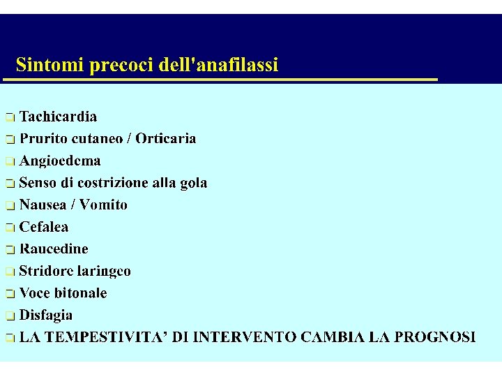 PROGNOSI Condizionata: Tempestività dell’intervento • Dose e modalità di esposizione all’allergene • Tempo di latenza, quanto più tardivo l’esordio, tanto minore la gravità e decorso • Aritmie cardiache, cardiopatie possono peggiorare il quadro clinico