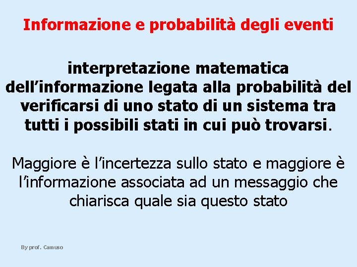 Informazione e probabilità degli eventi interpretazione matematica dell’informazione legata alla probabilità del verificarsi di uno stato di un sistema tra tutti i possibili stati in cui può trovarsi. Maggiore è l’incertezza sullo stato e maggiore è l’informazione associata ad un messaggio che chiarisca quale sia questo stato By prof. Camuso