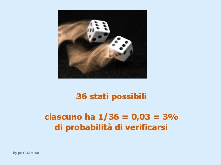 36 stati possibili ciascuno ha 1/36 = 0, 03 = 3% di probabilità di verificarsi By prof. Camuso