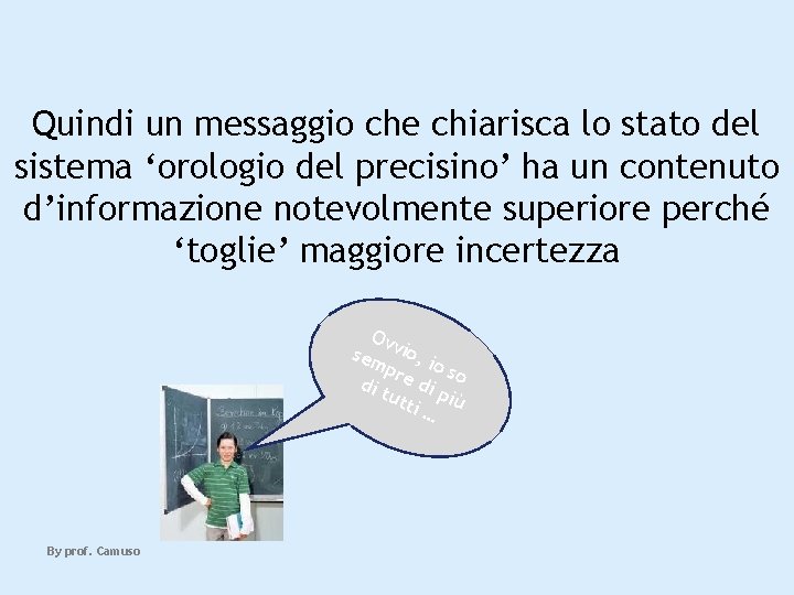 Quindi un messaggio che chiarisca lo stato del sistema ‘orologio del precisino’ ha un contenuto d’informazione notevolmente superiore perché ‘toglie’ maggiore incertezza Ovv sem io, i pre o so di t di utt più i… By prof. Camuso