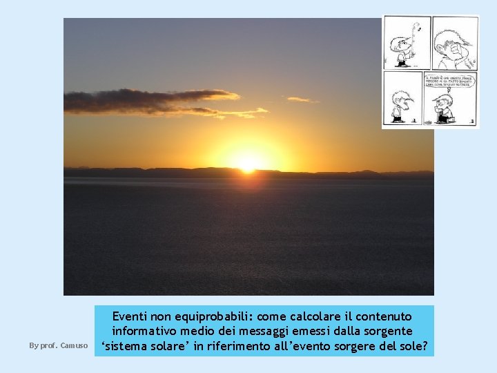 By prof. Camuso Eventi non equiprobabili: come calcolare il contenuto informativo medio dei messaggi emessi dalla sorgente ‘sistema solare’ in riferimento all’evento sorgere del sole?