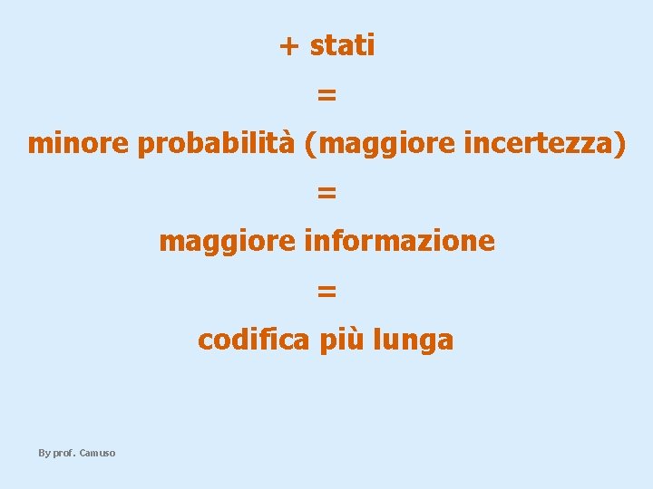 + stati = minore probabilità (maggiore incertezza) = maggiore informazione = codifica più lunga By prof. Camuso