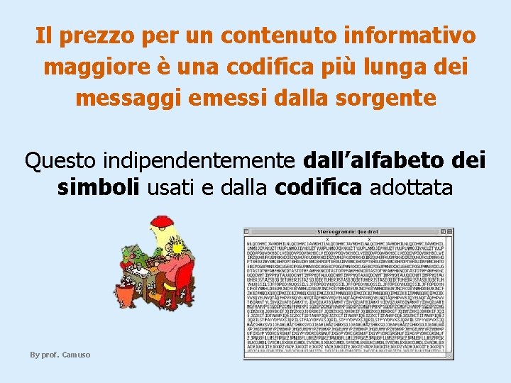 Il prezzo per un contenuto informativo maggiore è una codifica più lunga dei messaggi emessi dalla sorgente Questo indipendentemente dall’alfabeto dei simboli usati e dalla codifica adottata By prof. Camuso