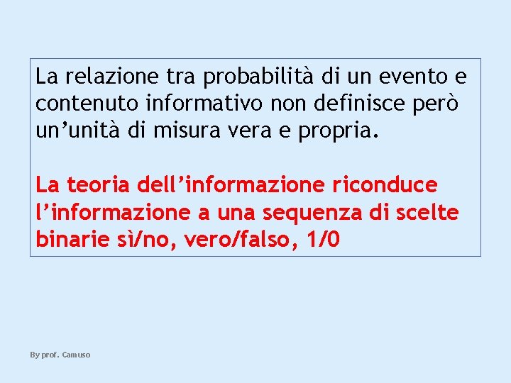 La relazione tra probabilità di un evento e contenuto informativo non definisce però un’unità di misura vera e propria. La teoria dell’informazione riconduce l’informazione a una sequenza di scelte binarie sì/no, vero/falso, 1/0 By prof. Camuso