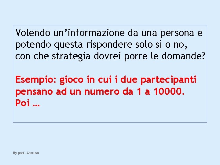 Soluzione: quella che ad ogni risposta dimezza l’incertezza. Quindi con il gioco di prima … By prof. Camuso