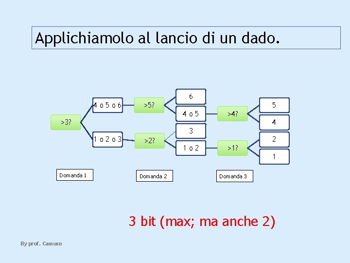 Applichiamolo al lancio di un dado. 6 4 o 5 o 6 >5? 5 4 o 5 >4? >3? 4 3 1 o 2 o 3 >2? 2 1 o 2 >1? 1 Domanda 2 Domanda 3 3 bit (max; ma anche 2) By prof. Camuso