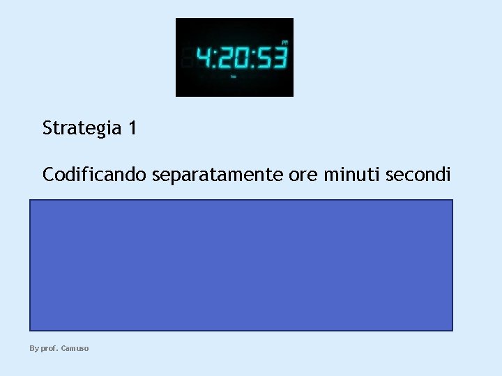 Strategia 1 Codificando separatamente ore minuti secondi 24 ore: servono 5 bit 25 = 32>=24 60 minuti: servono 6 bit 26 = 64>=60 60 secondi: servono 6 bit 26 = 64>=60 In tutto: 5+6+6 = 17 bit By prof. Camuso